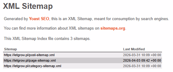 Mapa strony jest obecna i poprawnie wdrożona, z trzema głównymi plikami XML: post-sitemap.xml, page-sitemap.xml oraz category-sitemap.xml. Obejmuje kluczowe typy podstron, co sprzyja organizacji treści. Struktura wydaje się uporządkowana i spójna, z logicznym podziałem na sekcje. Brak jednak oznak niepożądanych adresów czy ewidentnych problemów technicznych, co pozytywnie wpływa na indeksację. Warto jednak zauważyć, że ostatnia modyfikacja niektórych adresów może sugerować potrzebę aktualizacji treści lub struktury.