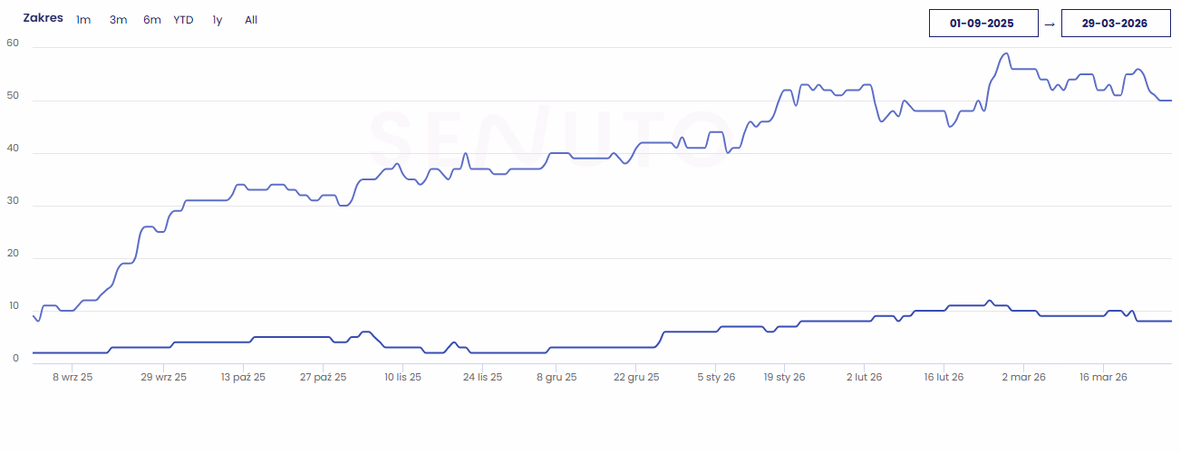 Taki układ wskazuje na potencjał do poprawy widoczności poprzez optymalizację już istniejących fraz, które mogą być użyte do osiągnięcia lepszych lokat w wyszukiwarkach.